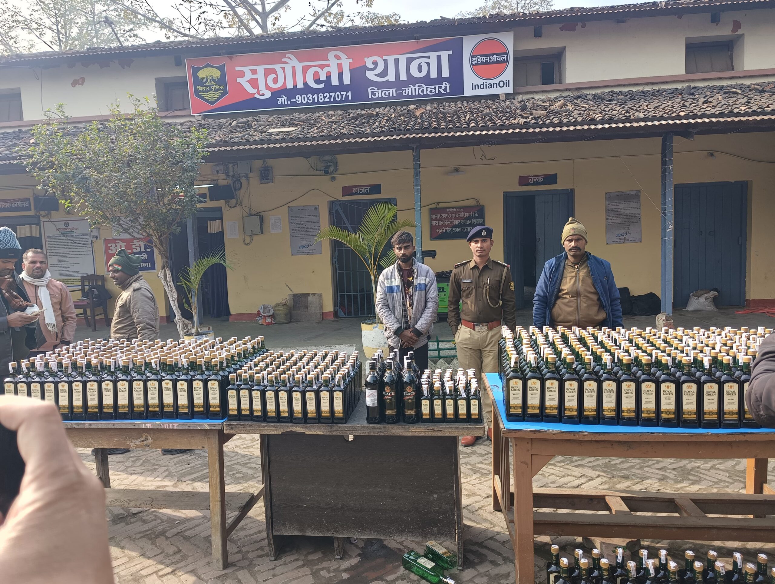 शराब की बड़ी खेप आने की सूचना पर सुगौली थाना क्षेत्र के छपवा बेतियां मुख्य मार्ग के श्रीपुर चौक के पास एक डीसीएम वाहन से भारी मात्रा में हरियाणा निर्मित विदेशी शराब बरामद की गई। तलाशी के दौरान हरियाणा निर्मित रॉयल ग्रीन ब्रांड की 750 एमएल की 405 बोतलें, 375 एमएल की 94 बोतलें, 180 एमएल की 35 बोतलें तथा ब्लैक बकार्डी की 11 बोतलें जब्त की गईं। कुल 547 बोतल शराब बरामद की गई।