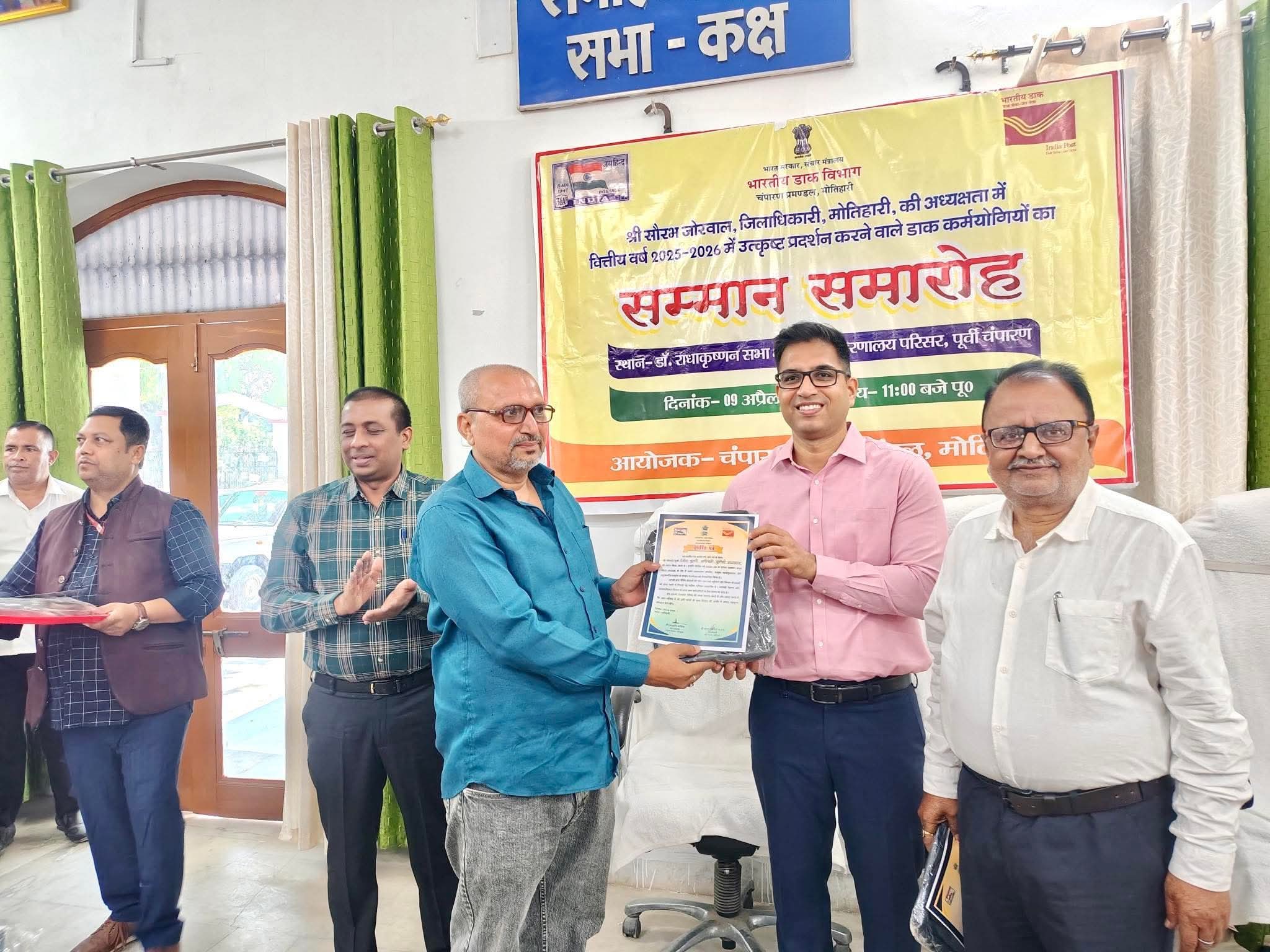 वित्तीय वर्ष 2025-26 के दौरान उत्कृष्ट कार्य करने वाले 70 से अधिक डाक कर्मियों व डाक अभिकर्ताओं  को समाहरणालय मोतिहारी स्थित डॉ राधाकृष्णन सभागार में