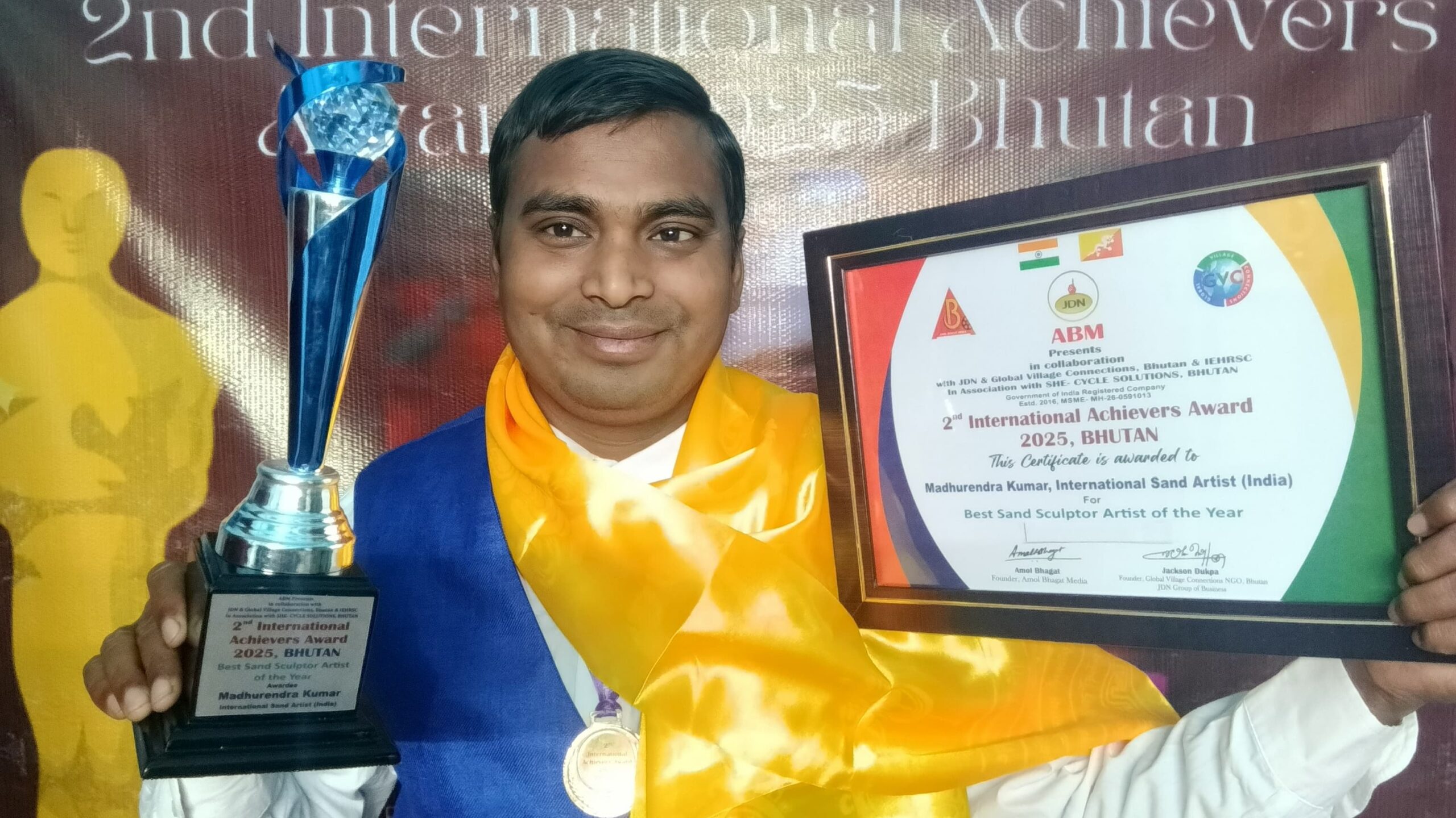 भूटान में “बेस्ट सैंड स्कल्पचर आर्टिस्ट ऑफ द ईयर” का खिताब जीत कर सैंड आर्टिस्ट मधुरेंद्र ने बढ़ाया भारत मान