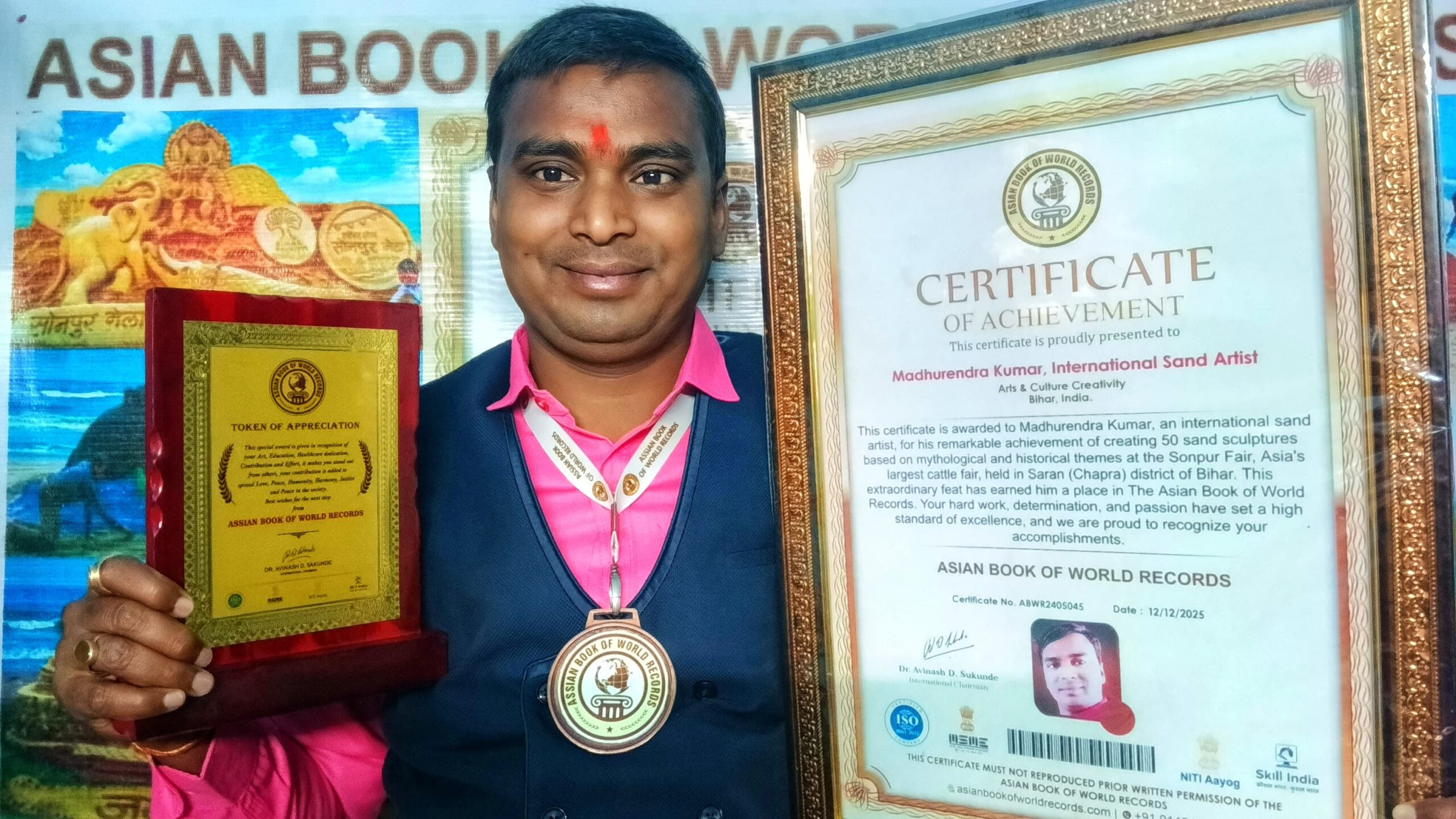 सोनपुर मेला में पहली बार बना विश्व रिकॉर्ड अंतरराष्ट्रीय सैंड आर्टिस्ट मधुरेंद्र कुमार का नाम एशियन बुक ऑफ वर्ल्ड रिकॉर्ड्स में दर्ज