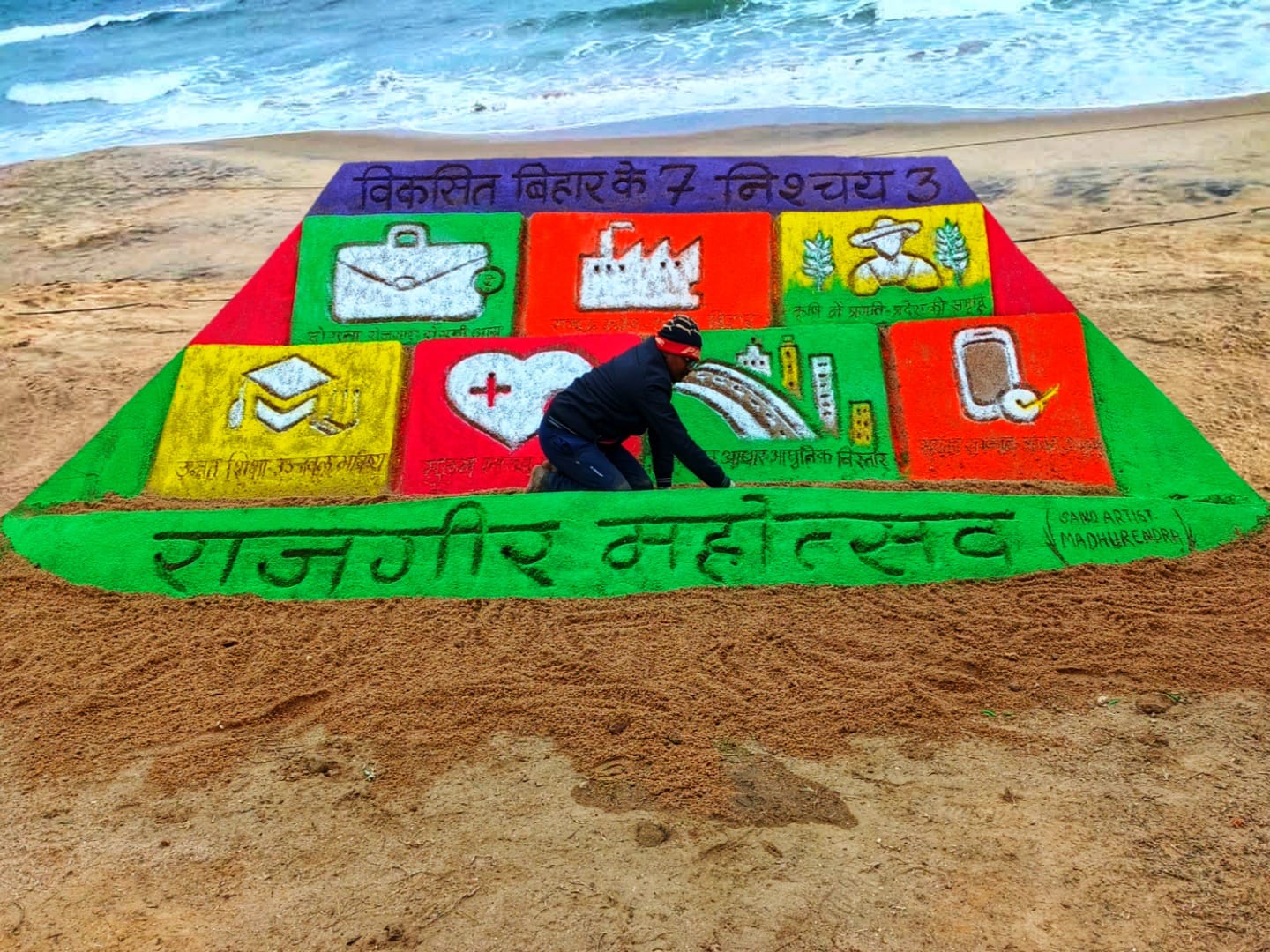 राजगीर महोत्सव में सैंड आर्टिस्ट मधुरेंद्र ने रेत पर उकेरी सात निश्चय-3 योजना, बनी राजगीर महोत्सव का मुख्य आकर्षण